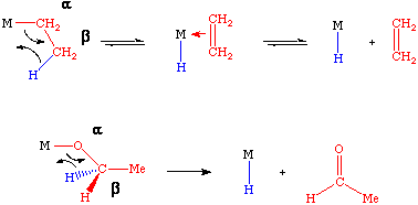 Beta-hydride elimination is a common reaction in organometallic chemistry. The reaction is simply the transfer of a hydride (hydrogen atom) from the beta-position on a ligand to the metal center. While most common in alkyl complexes, it is also observed with other ligands, one example being alkoxide ligands bound to late transition metal complexes: