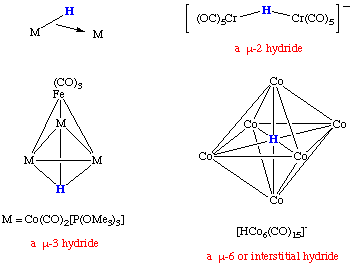 Hydride ligands display a diverse array of bonding modes, a few of which are shown below. Metal complexes where the hydride ligands are terminal or bridging two metal centers are by far the most common bonding modes.