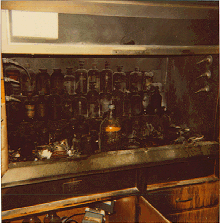 Figure 1. View of the fume hood where the accident occurred. Notice the large number of chemicals involved in the conflagration and the broken/melted chemical containers. Notice the large number which did not shatter or break, but could have detonated while the fire was being extinguished. |