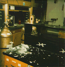The explosion blew glass shrapnel across the laboratory. Students on the other side of the laboratory were hit with glass fragments, including at least one who reported that the glass bounced off his safety goggles. Thankfully, this student was following the rule you must wear your safety glasses at all times in the laboratory even if you aren't "doing anything."